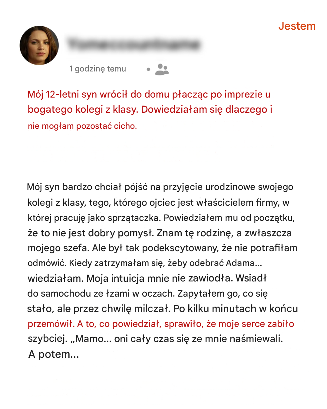 Jestem wdową i pracuję jako gosposia, aby mój syn był bezpieczny, najedzony i dumny z tego, kim jesteśmy. Ale zaproszenie na imprezę przypomniało mi, że nie wszyscy postrzegają nas w ten sam sposób. Kiedy wrócił do domu zalany łzami z imprezy u bogatego kolegi z klasy, wiedziałem, że coś jest nie tak… i nie zamierzałem siedzieć cicho.