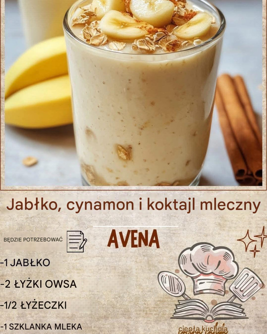 Połączenie jabłka, cynamonu i owsa to nie tylko festiwal smaków, ale także potężna dawka korzyści zdrowotnych. Na zdjęciu widzimy pięknie podany koktajl z plasterkami banana i płatkami owsianymi, co podkreśla jego świeżość i naturalność.