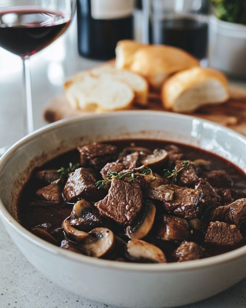 Ta wołowina po burgundzku doskonale komponuje się z kremowym puree ziemniaczanym lub chrupiącym bochenkiem chleba, aby wchłonąć cały pyszny sos. Możesz również rozważyć podanie jej z pieczonymi warzywami lub prostą zieloną sałatką, aby dodać świeżości do posiłku. Aby nadać potrawie wyjątkowego charakteru, posyp ją świeżą pietruszką tuż przed podaniem.