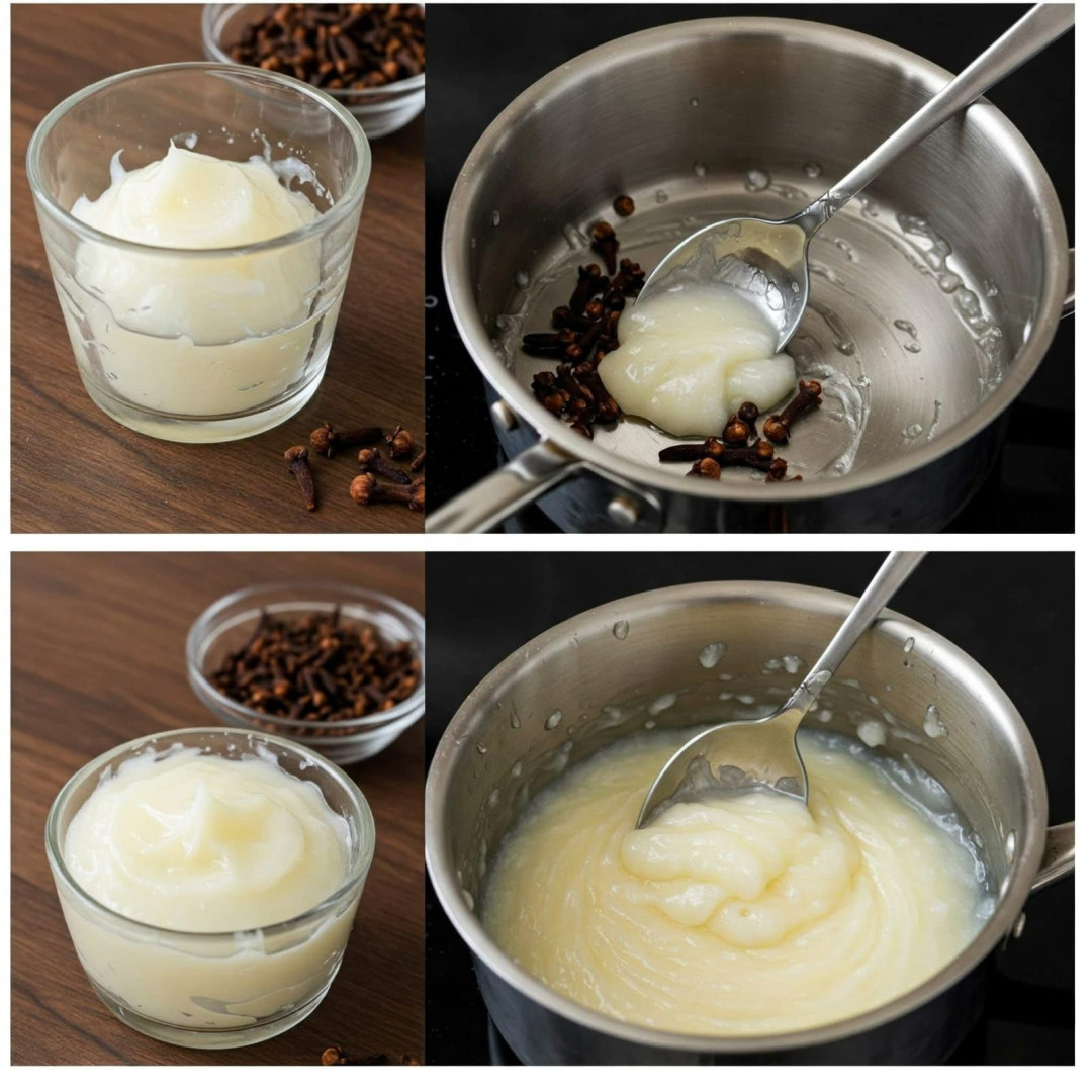 Wymieszaj składniki: Gdy wazelina zmięknie, dodaj zmielone goździki lub olejek goździkowy. Dokładnie mieszaj, aż oba składniki dobrze się połączą. Mielone goździki lub olejek goździkowy wsiąkną w wazelinę, tworząc gładką, pachnącą mieszankę.